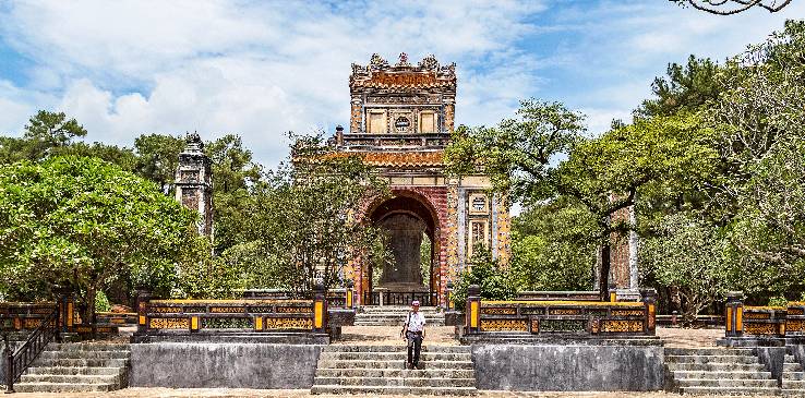In the morning, guide will pick you up at your hotel then bike to see Khai Dinh tomb, on the way from Hue city to Khai Dinh Tomb we stop to photo countryside sceneries. The tomb is on low hill, we walk up 29 steps to reach the tomb. First thing we see is imperial audience court, in the centre of which stands the octagonal stele monument also made of reinforced concrete. Farther on both sides of the courtyard, there are two rows of statues are facing towards the court center. In addition to these statues, similar to those of the other tombs, there are six more couples representing bodyguard soldiers and more things to see.