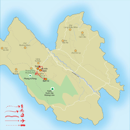 Morning, you will cycle into Sa Pa valley and experience the fantastic scenery of mountains and rice paddy fields along the way. You will make a turn right to Sin Chai village and continue cycling off road to Ta Van village, break stops to talk with the Black Hmong or Giay who are working on their fields, or have a green tea in their house. You will have lunch in the Black Hmong village of Su Pan then continue cycling downhill to Ban Ho village, which is inhabited by the Tay people. Here you can experience the daily life of villagers who live in their traditional stilt houses surrounded by rice terraces and vegetable gardens; walk to the nearby Lavie waterfall, where you can swim or trek uphill to visit to Red Dao village of Nam Toong. Your vehicles will then pick you at Ban Ho village and transfer you back to Sa Pa.